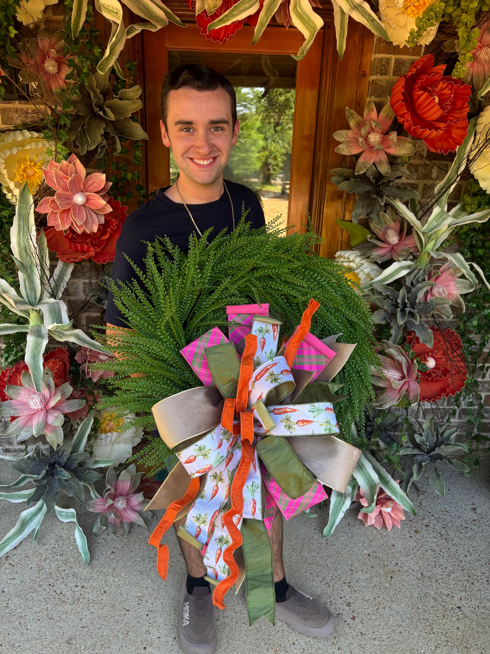 This is a JG custom designed door hanger! All Wreaths are made with high end permanent botanicals, designer wired ribbons, and quality accents. All wreaths are custom, so no 2 are exactly the same! Each wreath is sprayed with UV protective sealer to protect against fading. This wreaths is approx 24inches wide.