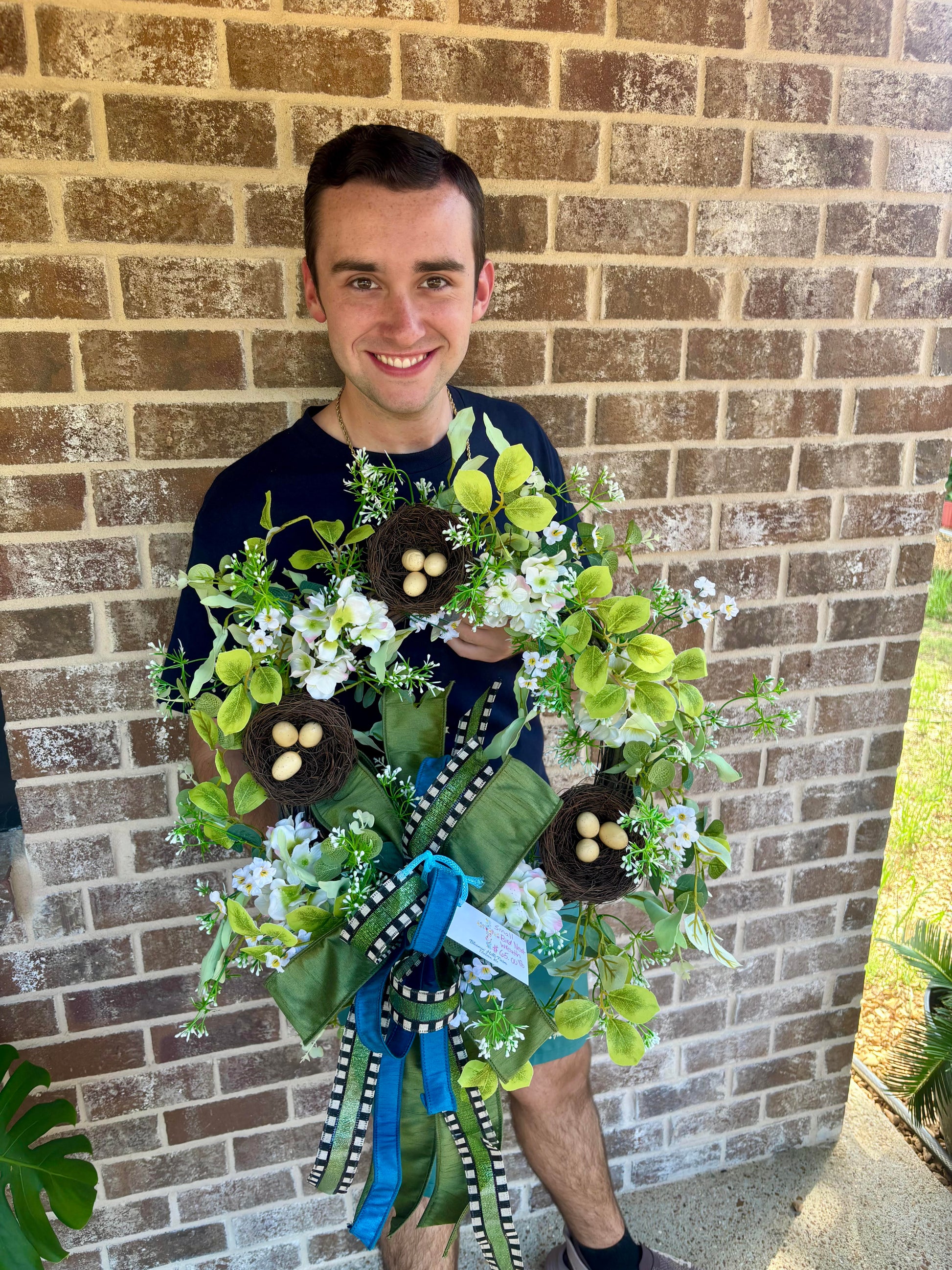This is a JG custom designed door hanger! All Wreaths are made with high end permanent botanicals, designer wired ribbons, and quality accents. All wreaths are custom, so no 2 are exactly the same! Each wreath is sprayed with UV protective sealer to protect against fading. This wreaths is approx 18inches wide.