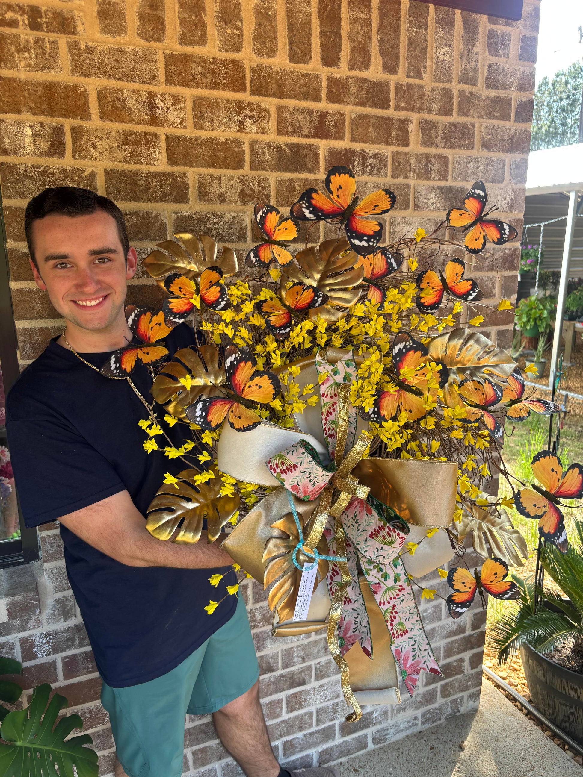 This is a JG custom designed door hanger! All Wreaths are made with high end permanent botanicals, designer wired ribbons, and quality accents. All wreaths are custom, so no 2 are exactly the same! Each wreath is sprayed with UV protective sealer to protect against fading. This wreaths is approx 24inches wide.