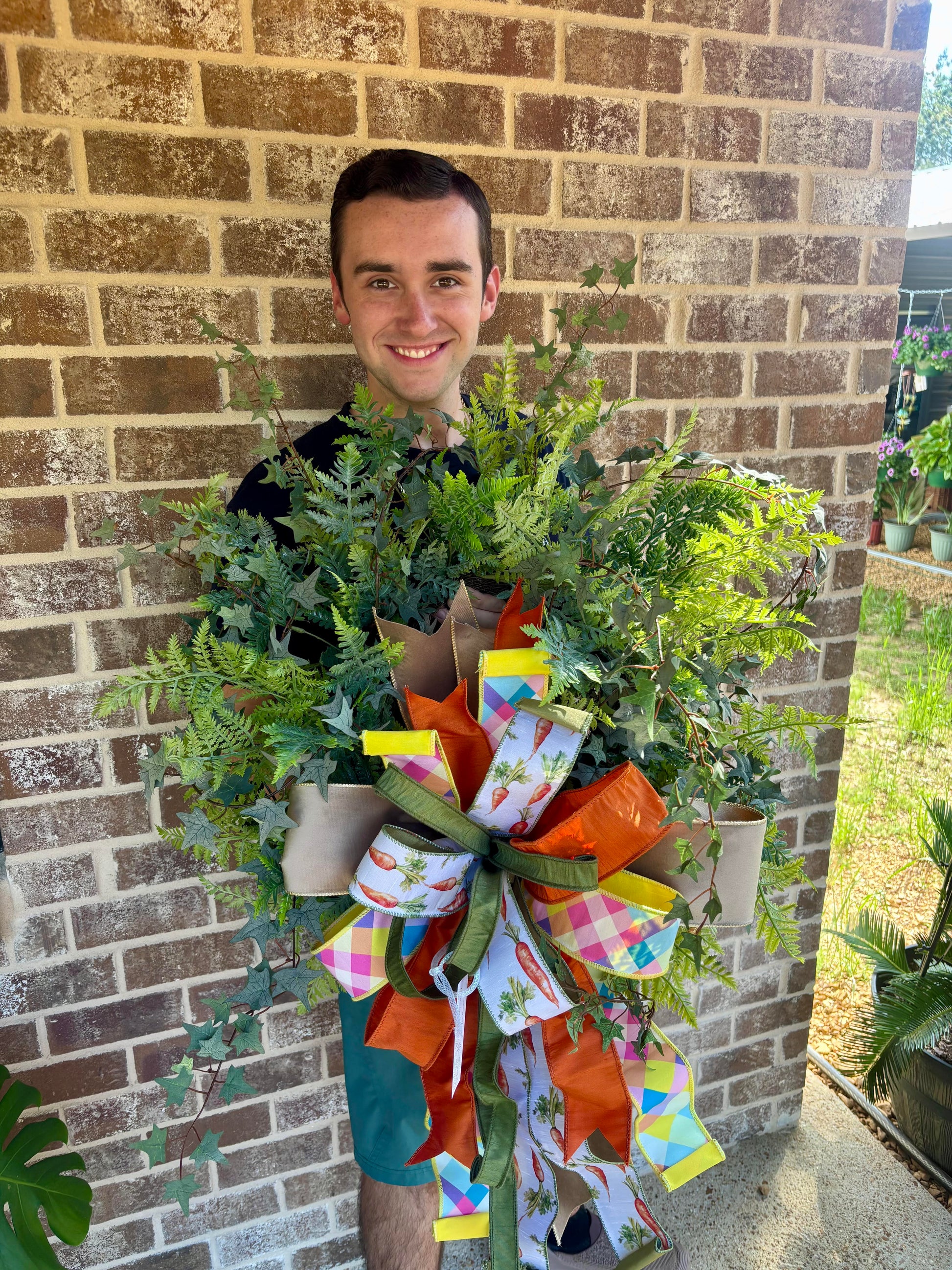 This is a JG custom designed door hanger! All Wreaths are made with high end permanent botanicals, designer wired ribbons, and quality accents. All wreaths are custom, so no 2 are exactly the same! Each wreath is sprayed with UV protective sealer to protect against fading. This wreaths is approx 24inches wide.