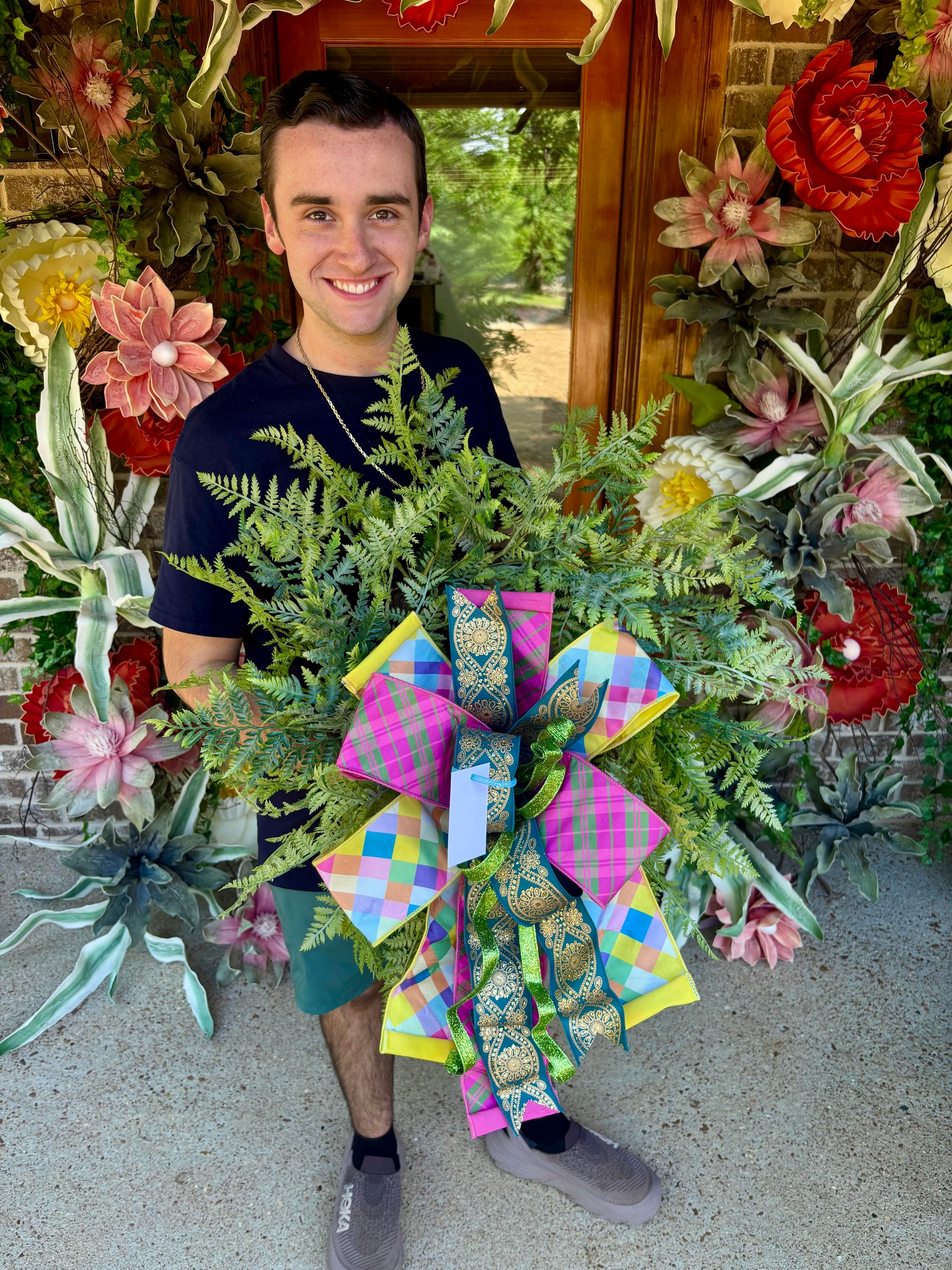 This is a JG custom designed door hanger! All Wreaths are made with high end permanent botanicals, designer wired ribbons, and quality accents. All wreaths are custom, so no 2 are exactly the same! Each wreath is sprayed with UV protective sealer to protect against fading. This wreaths is approx 24inches wide.