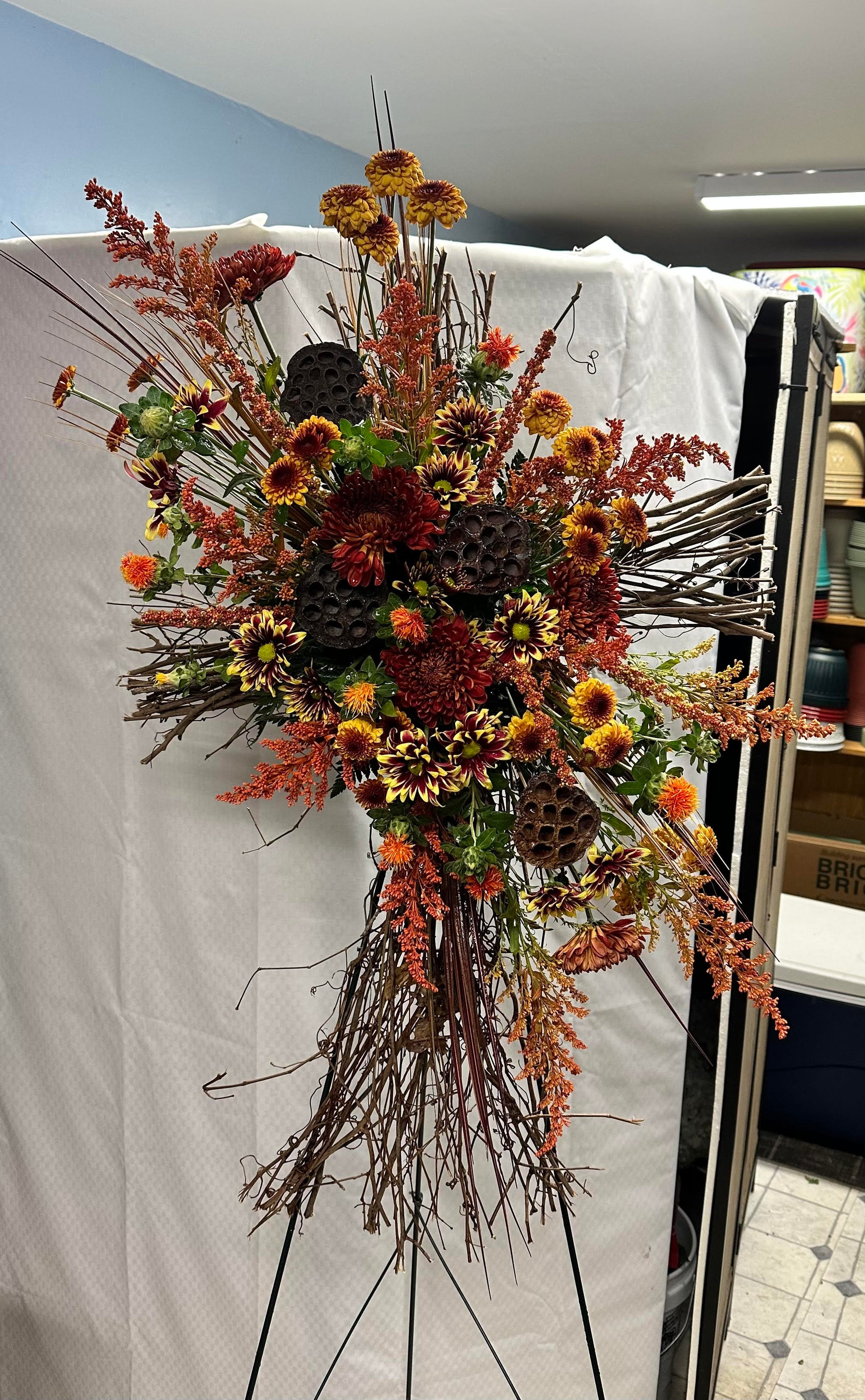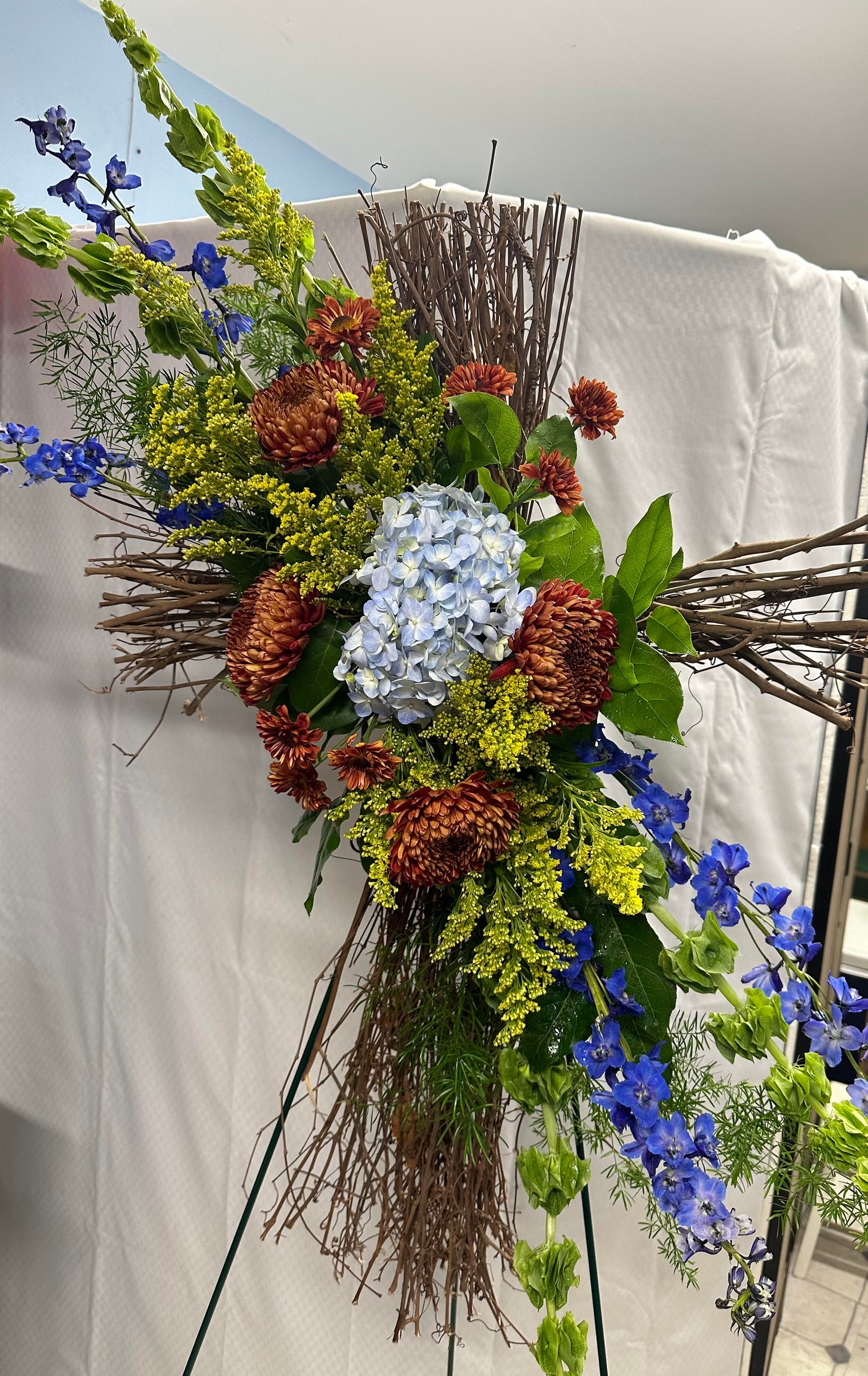 A beautiful arrangement of fresh flowers on a grapevine cross is a beautiful way to express your love & sympathy during a time of loss. Fresh Flowers can offer so much comfort & peace during such difficult times. Floral varieties change with seasonal availability, so Designers Choice Arrangements offer you the best & freshest selection of Flowers! at Bloomin' Hills quality is of upmost important, so we always promise beautiful blooms for any occasion! Pictures below are just for example.