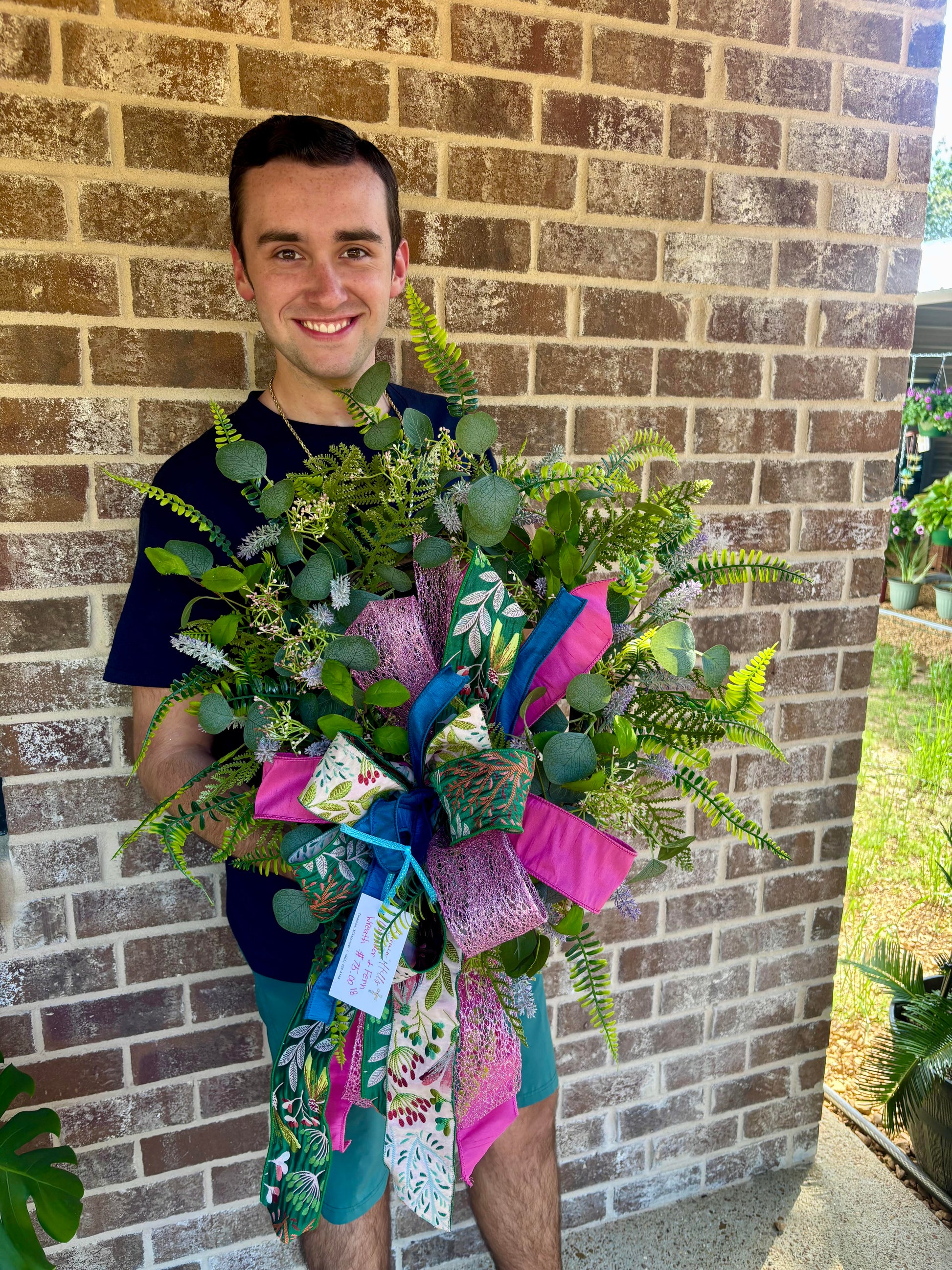 This is a JG custom designed door hanger! All Wreaths are made with high end permanent botanicals, designer wired ribbons, and quality accents. All wreaths are custom, so no 2 are exactly the same! Each wreath is sprayed with UV protective sealer to protect against fading. This wreaths is approx 18inches wide.