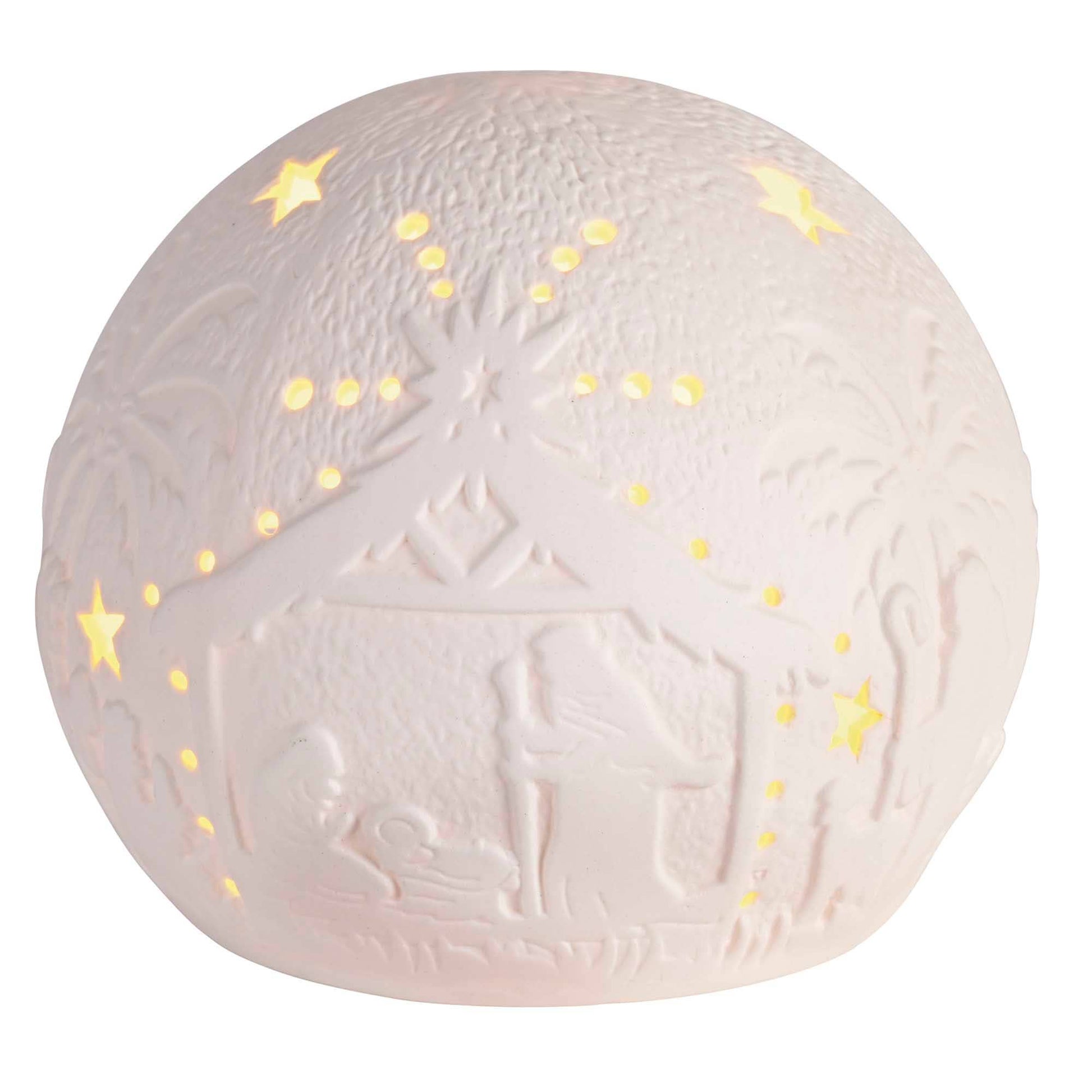 Porcelain Orb Figurine, Finished In White, Features A Nativity Scene. Star And Circular Cutouts In The Piece Allow The Light Inside To Softly Shine Through, When Switch Underneath Is Turned On. LED Bulb Uses Three Included LR44 Or Equivalent Button Cell Batteries. 4 Inches Tall.