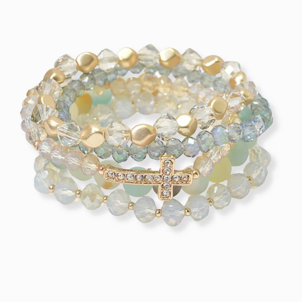 Pave Cross Accent Multi Layered Beaded Stretch Bracelet