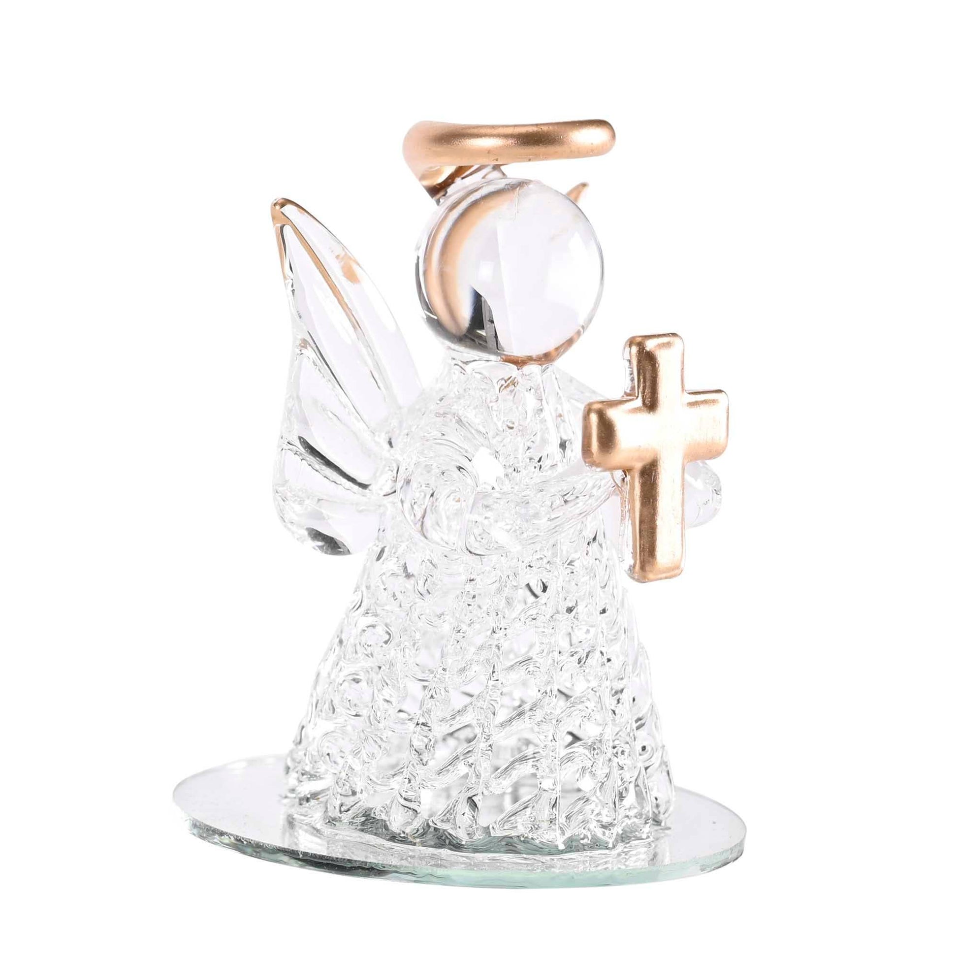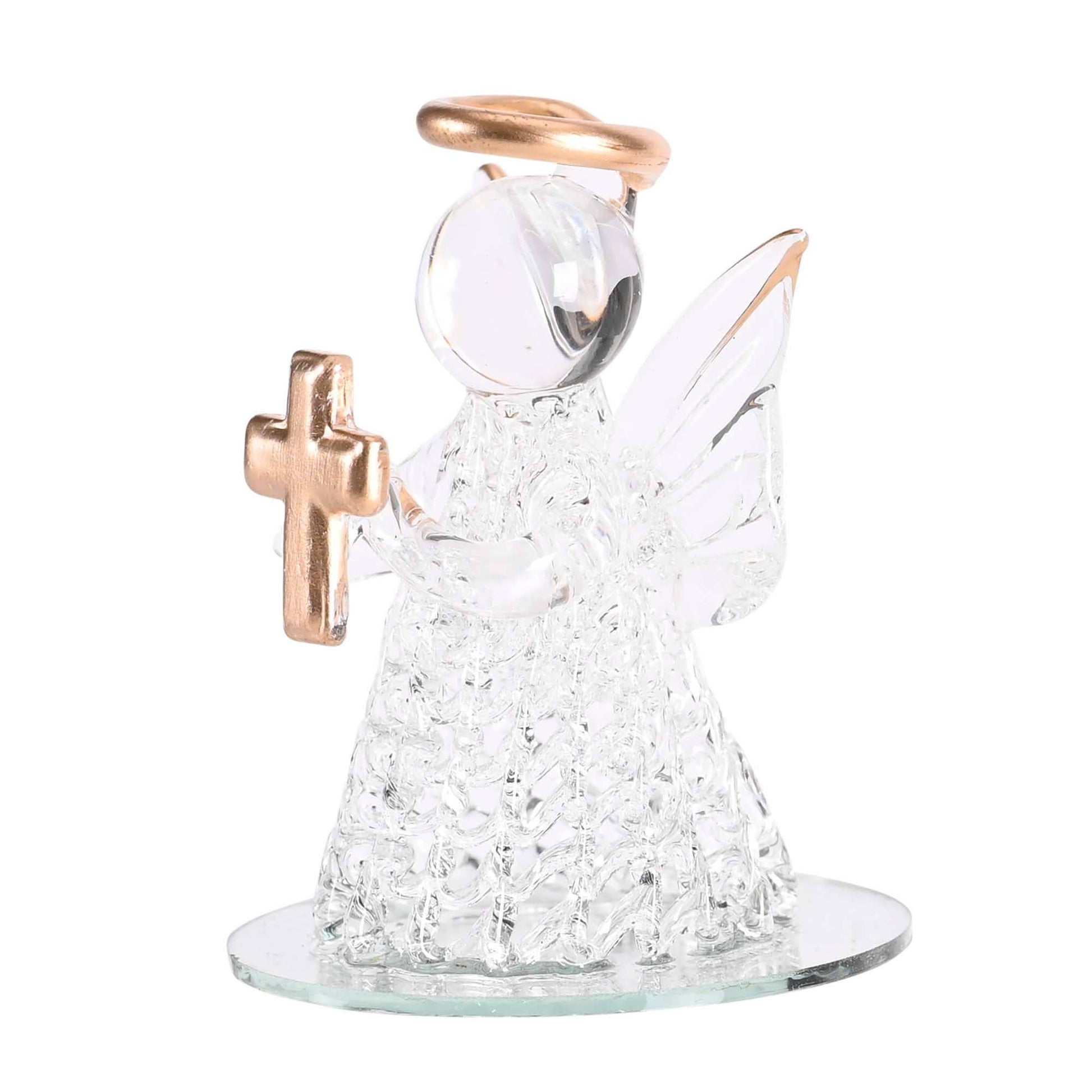 This Glass Angel Tabletop Decor Piece Is Holding A Gold Cross With A Gold Halo. The Tabletop Decor Piece Is Approximately 3 Inches High And Comes Packaged In A White Box With Color Label.