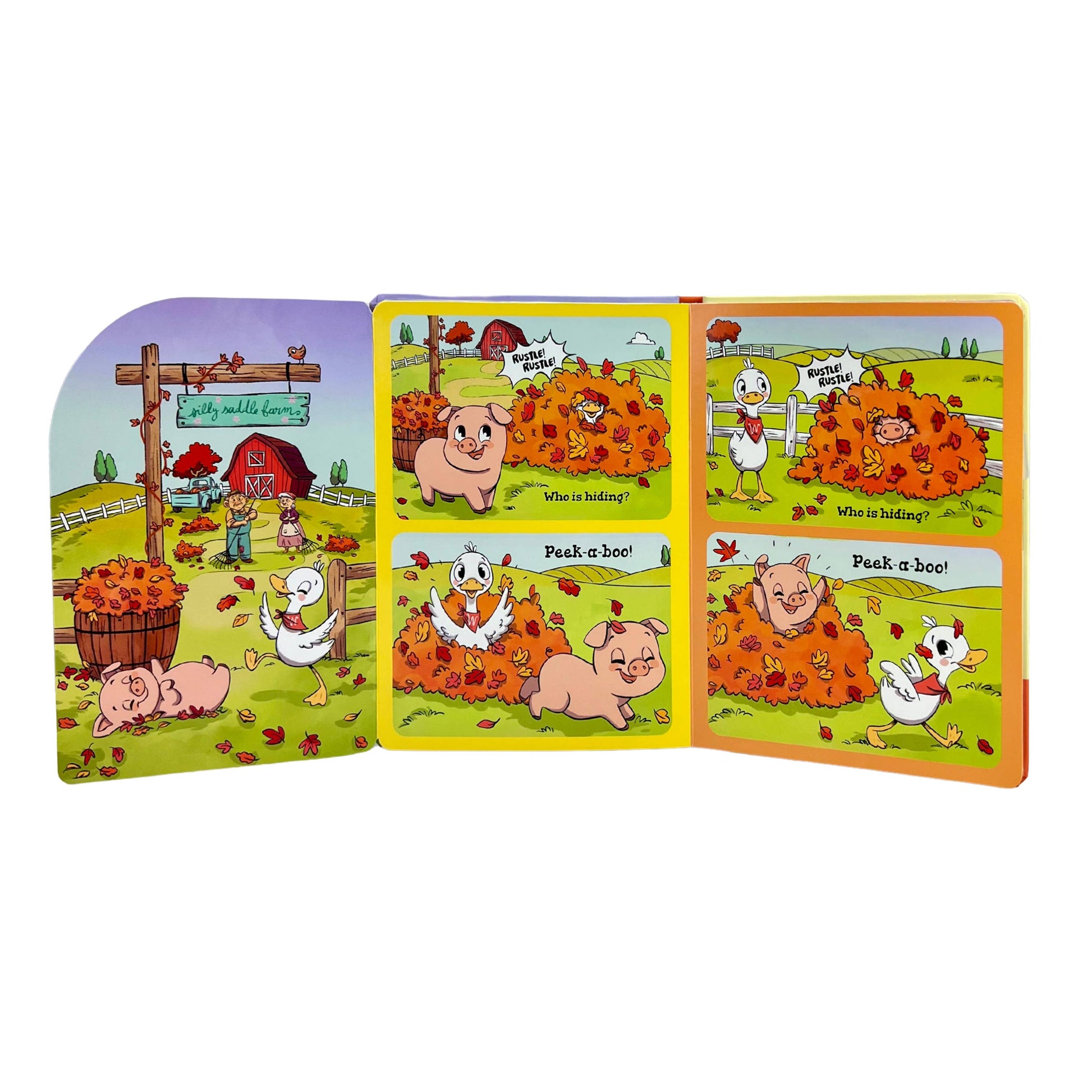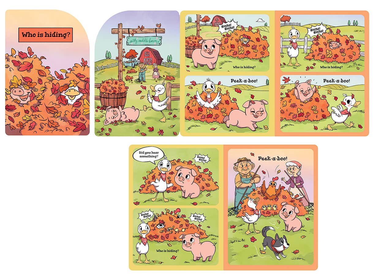 First, Waddle loves to pretend to drive the tractor and he’s over the moon when the farmer brings him for his very first ride. But what happens when the other animals want a turn on the tractor, too? Can the farmer think of a way to take everyone for an unforgettable ride? Then, raking fall leaves turns into silly peek-a-boo fun, when the animals take turns hiding in leaf piles. Using context clues, can your little one guess which critter is hiding?